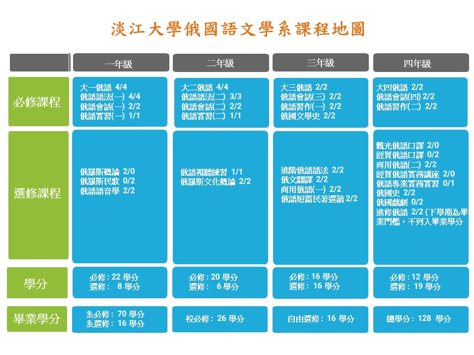 * 外語學門俄文(一)、俄文(二)不列入俄文組學生之畢業學分* Russian (I) and Russian (II) under the Foreign Languages discipline are not counted toward the graduation credits for students in the Division of Russian.