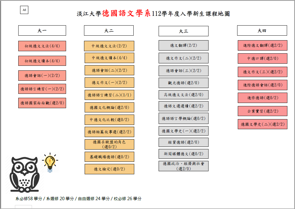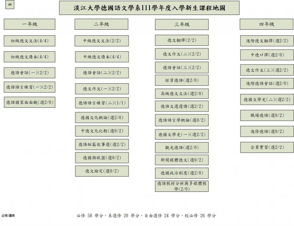 * 外語學門德文(一)、德文(二)不列入德文組學生之畢業學分* German (I) and Germann (II) under the Foreign Languages discipline are not counted toward the graduation credits for students in the Division of German.