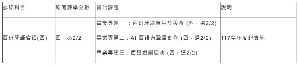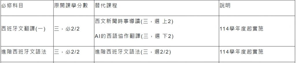 自114學年度入學新生起,原必修「西班牙語會話(四)」刪除,113學年度(含)以前入學學生相關應修科目異動及替代如下。