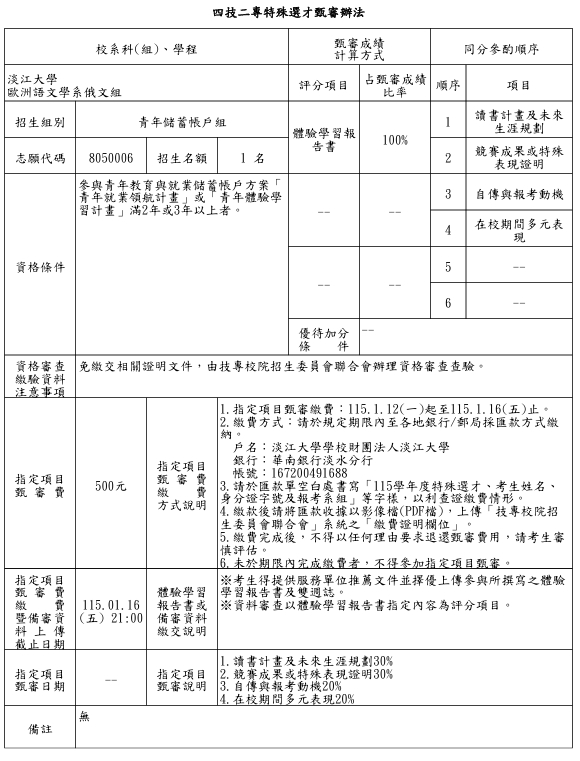 1、錄取生應將「淡江大學115學年度四技二專特殊選才錄取新生報到意願表」,於115年3月3日(二) 10:00前以E-MAIL或傳真方式辦理報到(放棄錄取資格亦請回覆),逾期不予受理。未回覆意願表或逾期回覆者,視同放棄錄取資格。