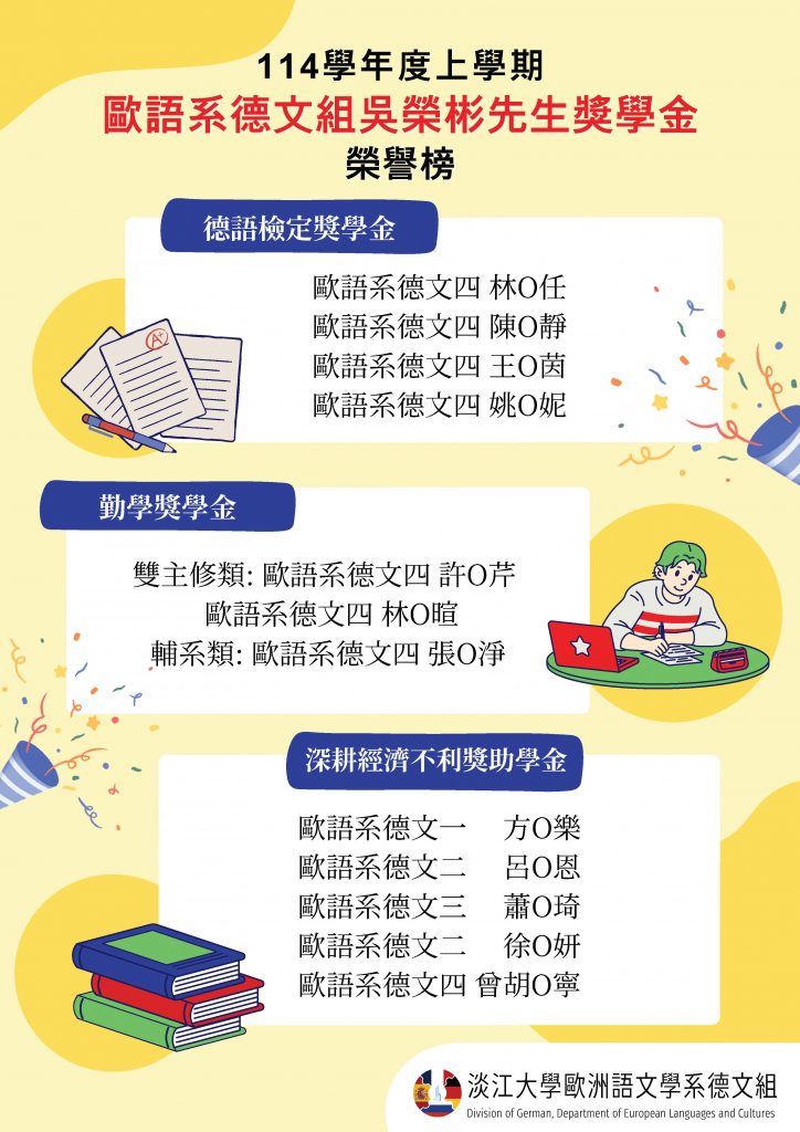 【德文組】公告114學年度歐語系德文組恒耀公司吳榮彬先生獎學金獲獎名單