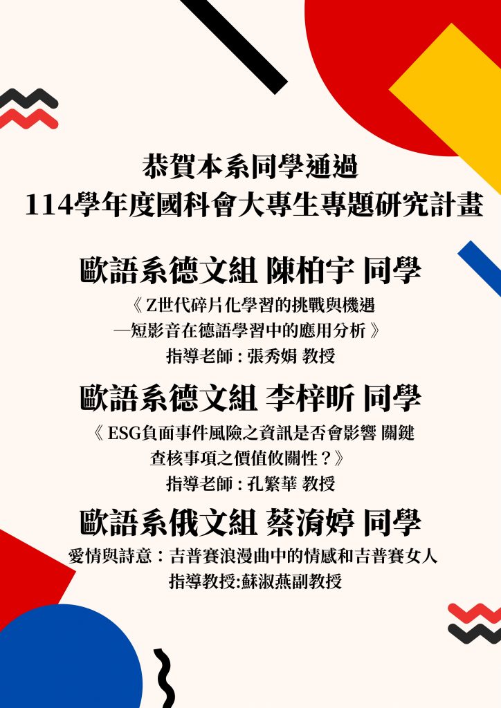 大四同學陳柏宇~Z世代碎片化學習的挑戰與機遇—短影音在德語學習中的應用分析大四同學李梓昕~ESG負面事件風險之資訊是否會影響關鍵查核事項之價值攸關性?