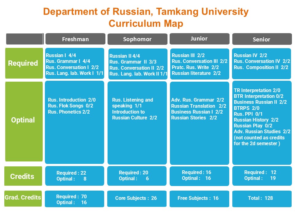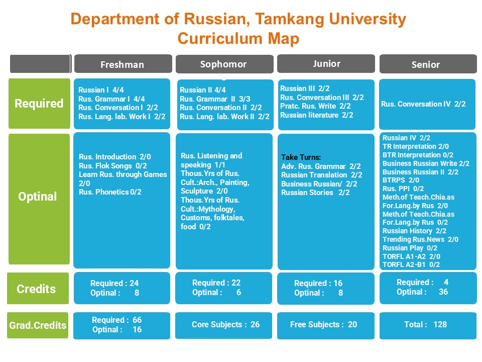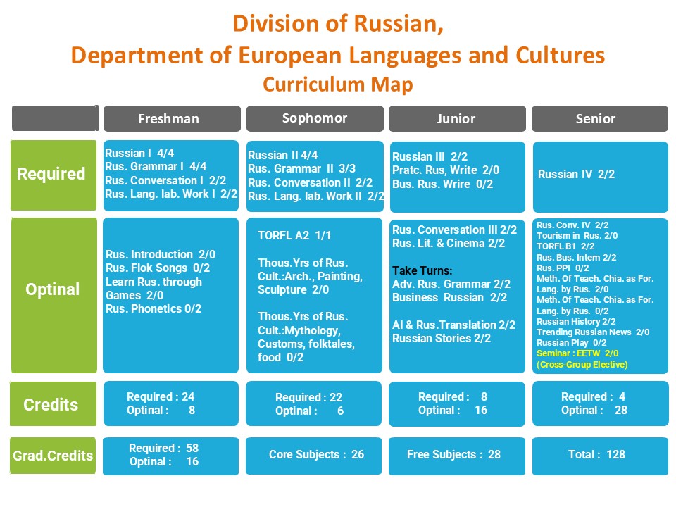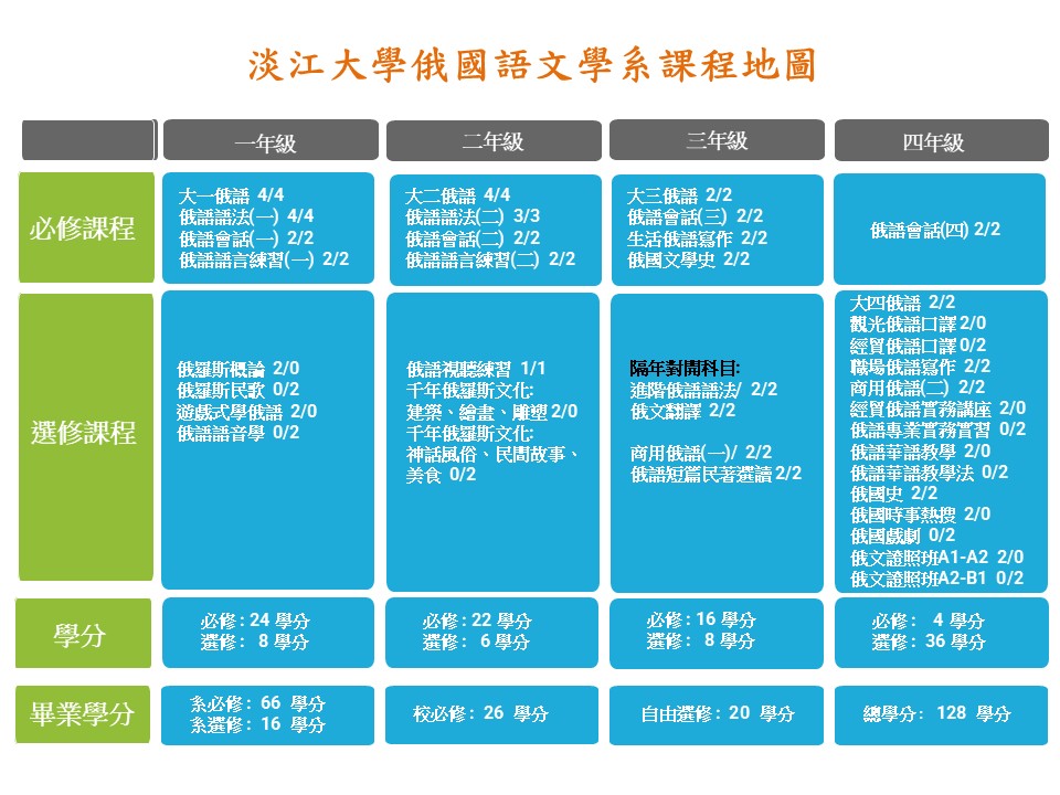 * 外語學門俄文(一)、俄文(二)不列入俄文組學生之畢業學分* Russian (I) and Russian (II) under the Foreign Languages discipline are not counted toward the graduation credits for students in the Division of Russian.