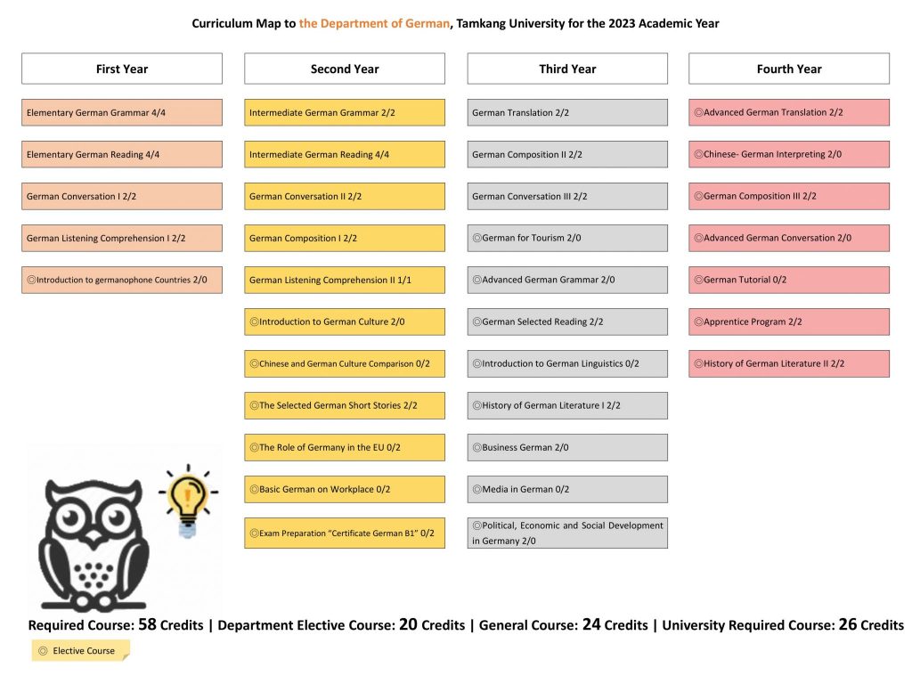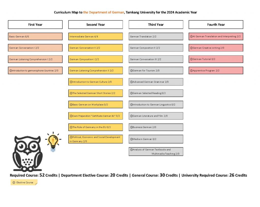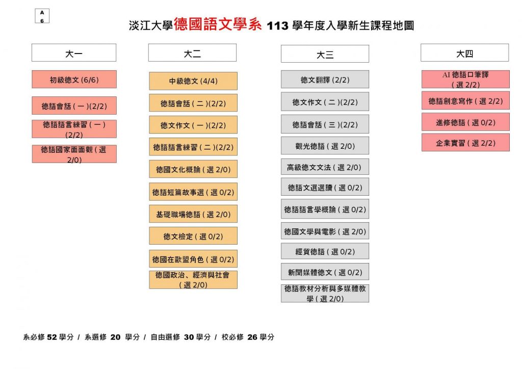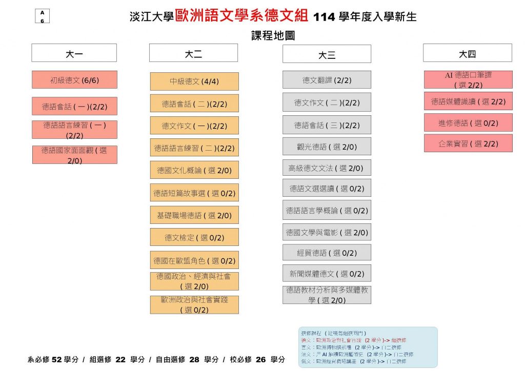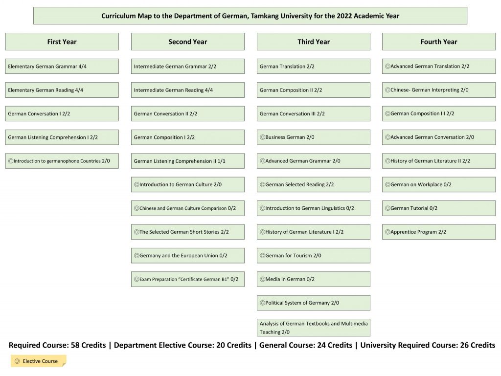 * 外語學門德文(一)、德文(二)不列入德文組學生之畢業學分* German (I) and Germann (II) under the Foreign Languages discipline are not counted toward the graduation credits for students in the Division of German.