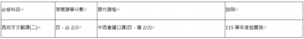 自114學年度入學新生起,原必修「西班牙語會話(四)」刪除,113學年度(含)以前入學學生相關應修科目異動及替代如下。